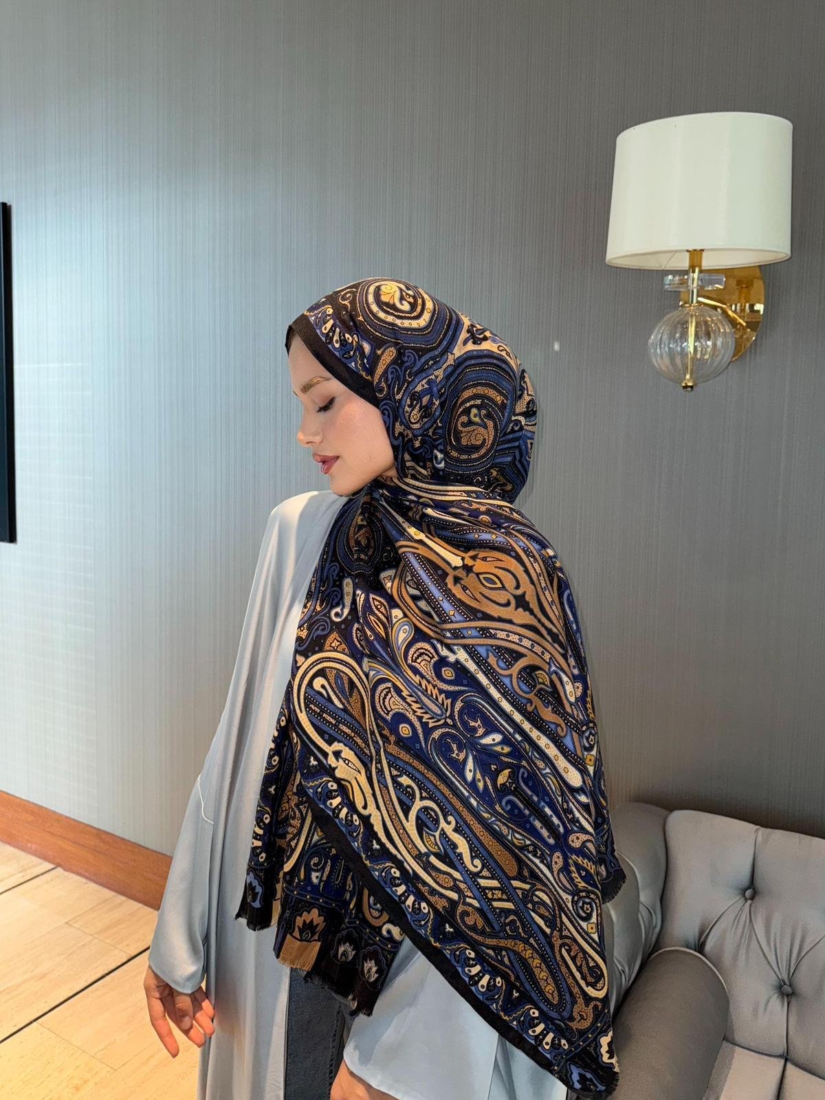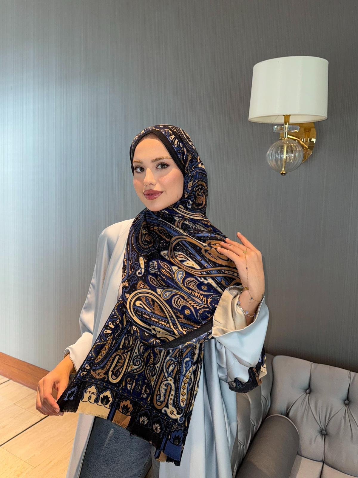 Etnik Desen Yün Kaşmir Şal Lacivert